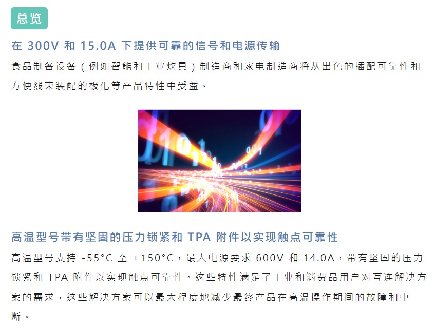 可在 300V 和 15.0A 電路中實現可靠的信號和電源傳輸。高溫型號支持 -55°C 至